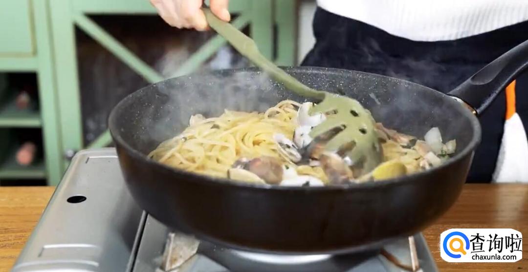 汤煮沸后,加入蛤蜊肉和意面。