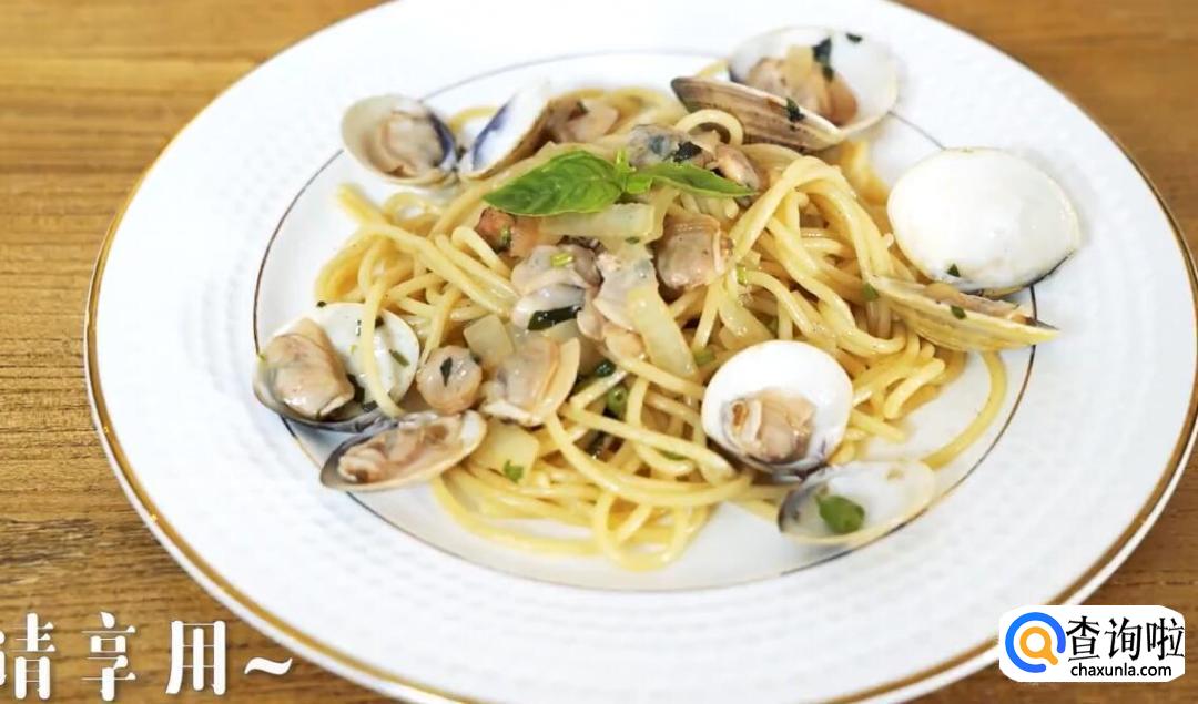 蛤蜊、欧芹、蒜、洋葱、罗勒、黄油、意面