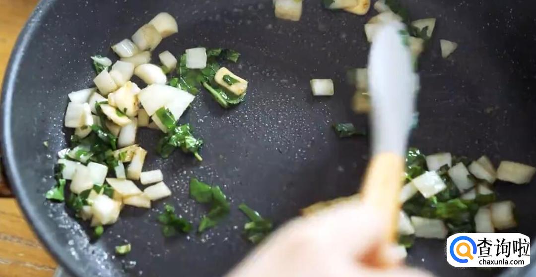 油融化后,加入蒜、洋葱、罗勒叶进行翻炒,直至炒出香味。