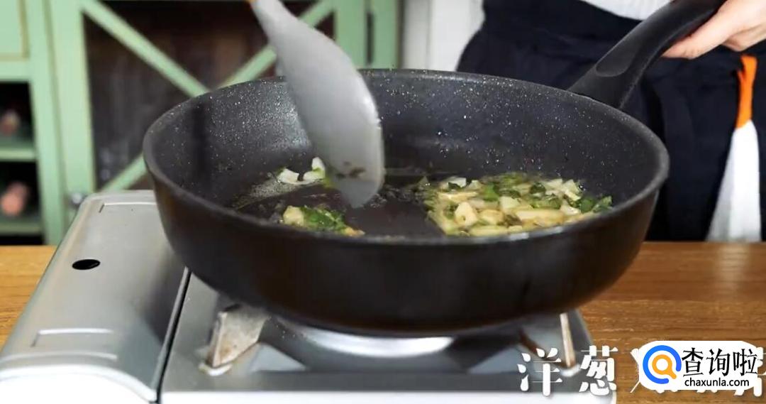 锅内加入黄油,黄油融化后,加入洋葱和欧芹翻炒,直至翻炒出香味。