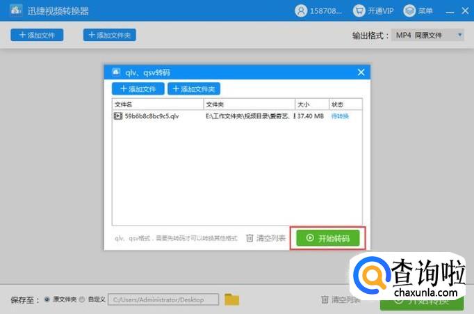 第三步:文件添加好了之后,这个时候系统会弹出一个文件转码的提示框,因为qlv格式比较特殊,所以在转换这种文件之前需要先将这种文件进行转码处理。