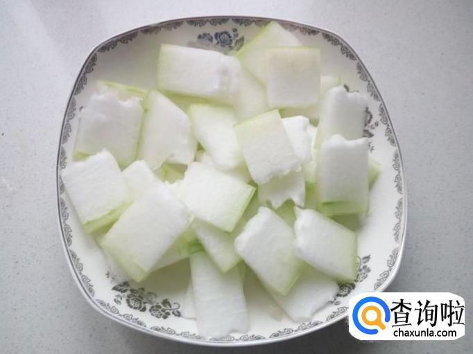 冬瓜去皮,用水清洗干净,控干水分,切成0.3公分左右厚的片(不要切的太薄)。