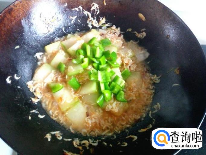 烧至冬瓜稍绵软,放入青椒,翻一下个,放入味精,关火出勺。