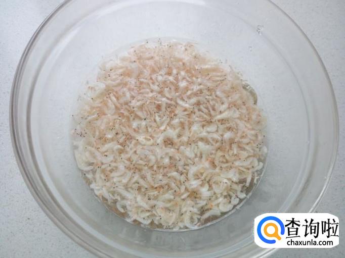 把虾皮放入水中浸泡几分钟使之变软,然后用水冲洗一下,控干水分,备用。