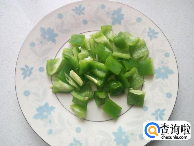 青椒用水清洗干净,控干水分,切成小块。