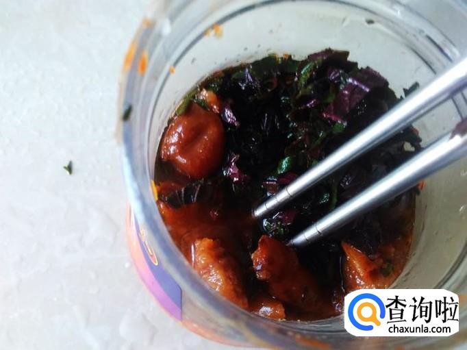24小时后,拿出来,酸梅紫苏辣椒酱已经很入味,成品已经变成紫红色,带着紫苏的香味非常好吃,可以拿做小菜或配料用。