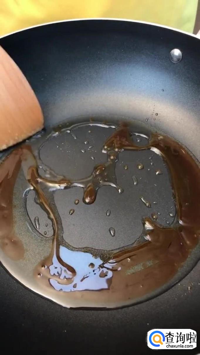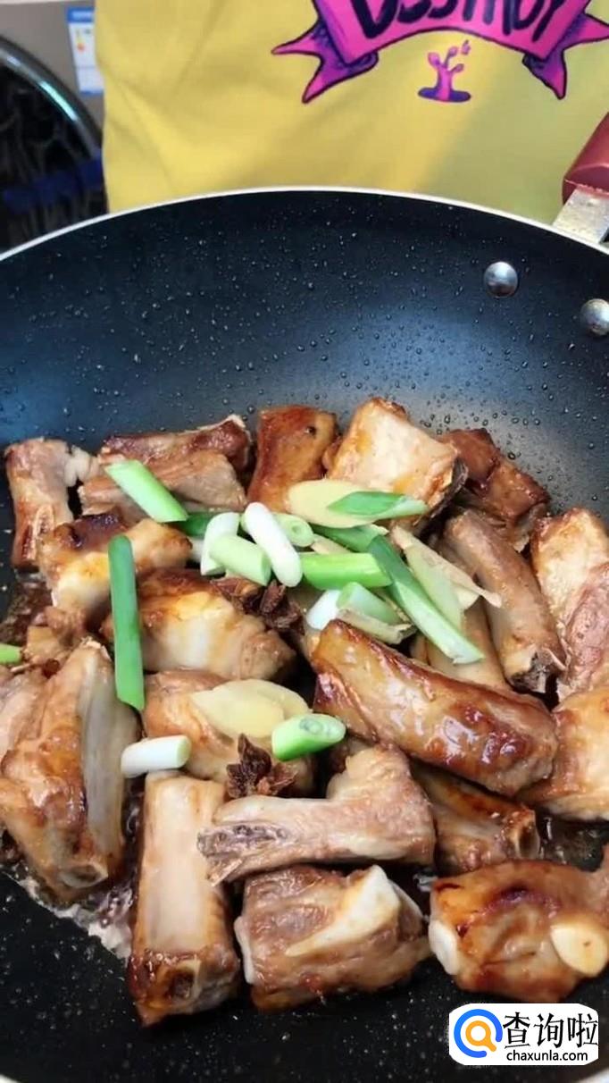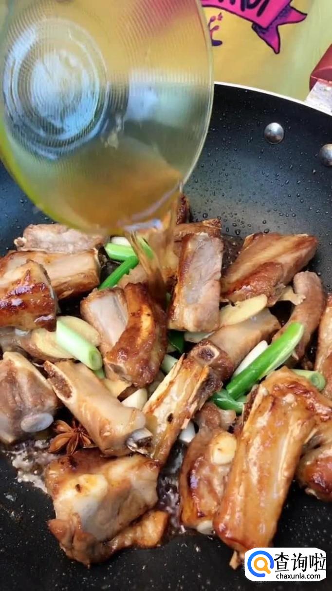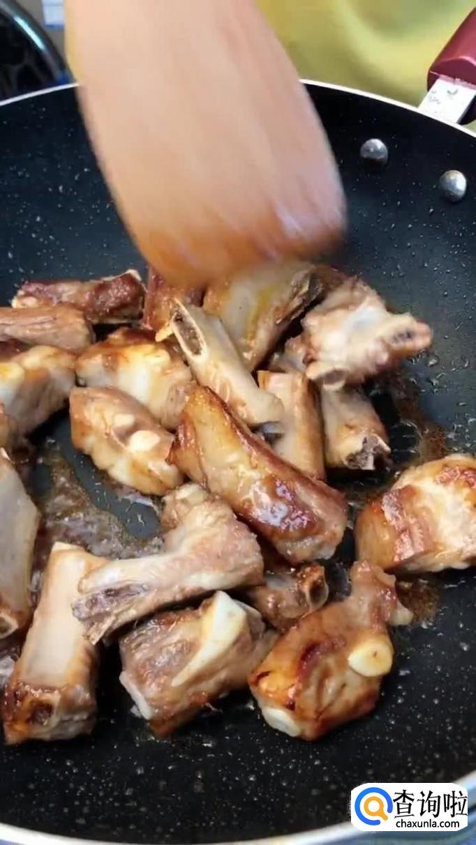 接着往锅中加入适量的白糖熬制金黄色,倒入排骨翻炒两分钟,如下图所示。