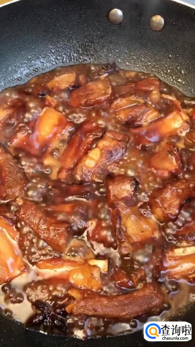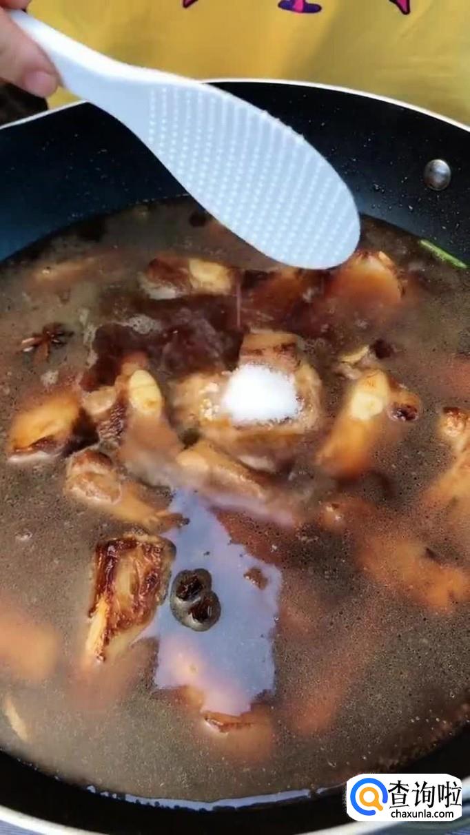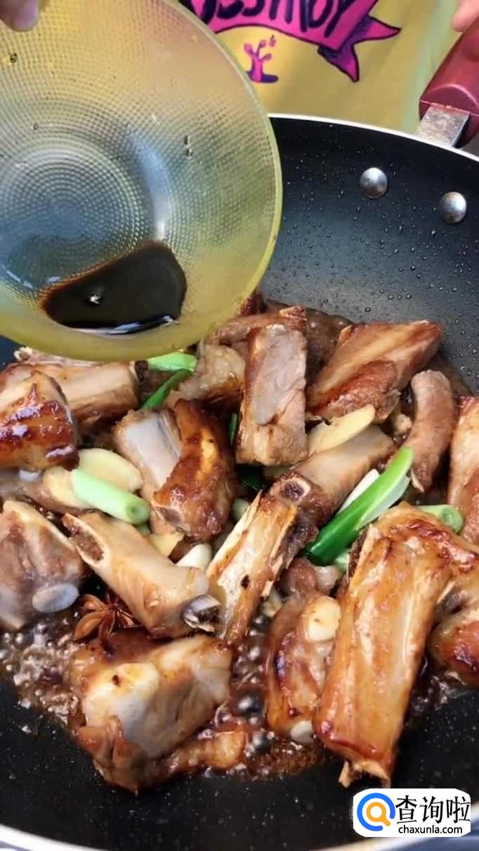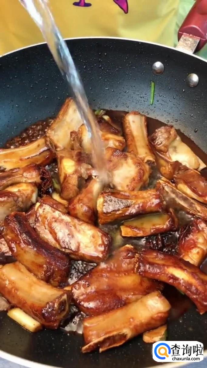 接着往锅中加入适量的白糖熬制金黄色,倒入排骨翻炒两分钟,如下图所示。