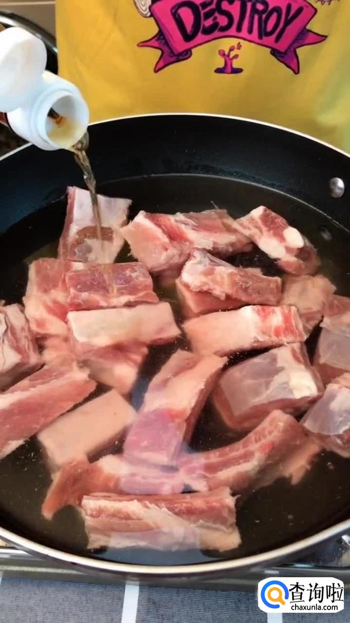 首先将排骨切好倒入锅中,加入适量的料酒,煮5分钟,如下图所示。