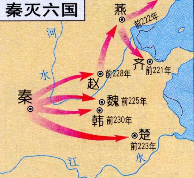 前230年灭韩、前228年灭赵国、前225年灭魏、前223年灭楚、前222年灭燕、前221年灭齐。公元前221年,秦始皇终于完成一统六国的愿望,建立史上第一个大一统的封建君主制朝代秦朝,中国历史进入了新篇章。