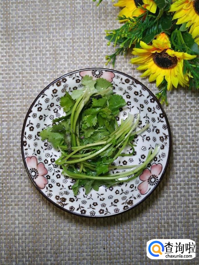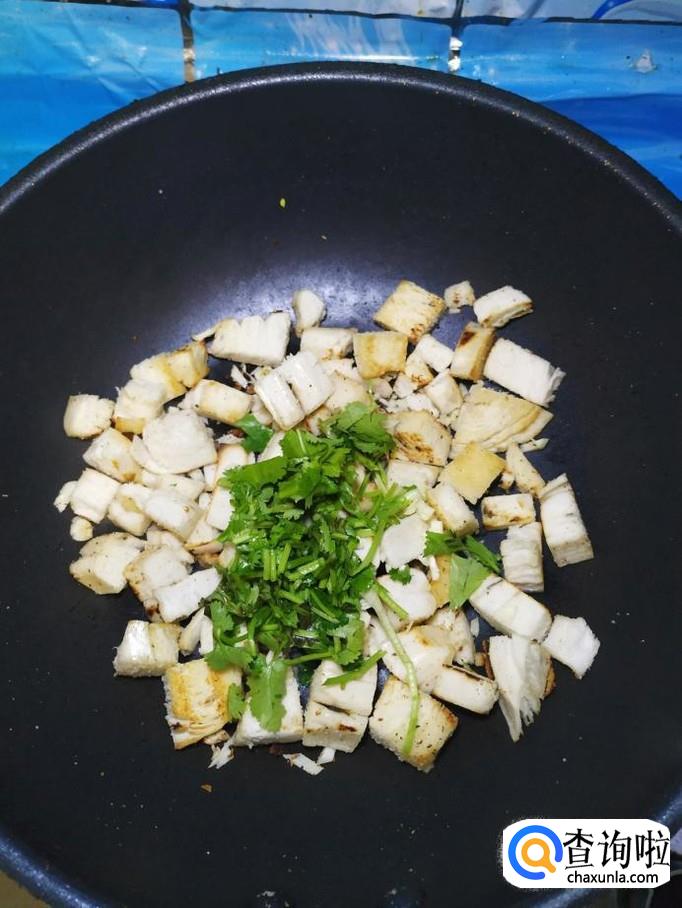 准备适量香菜,洗净后,切碎,撒入锅中,翻炒均匀。
