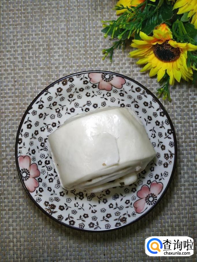 准备一个花卷,切成块,放入盘中备用。如果是新鲜的花卷,需要放冰箱冷藏室,这样切起来才不容易散。