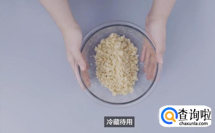 首先,制作酥粒。混合白砂糖50g、杏仁粉50g、中筋面粉50g、无盐黄油50g,揉成沙粒状,冷藏待用。
