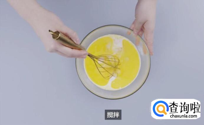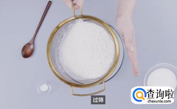 制作面糊。混合干料,倒入中筋面粉300g、泡打粉10g,过筛。