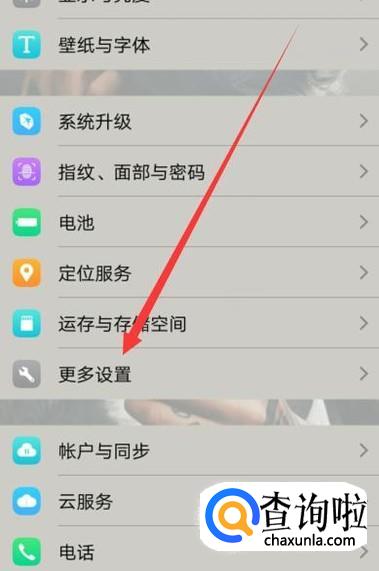 进入设置界面,找到“更多设置”,点击并进入,如图所示。