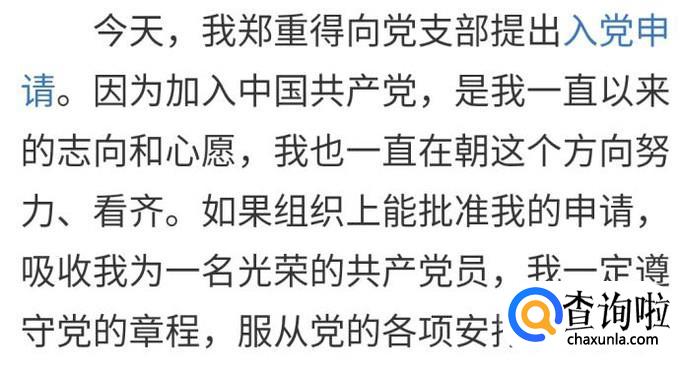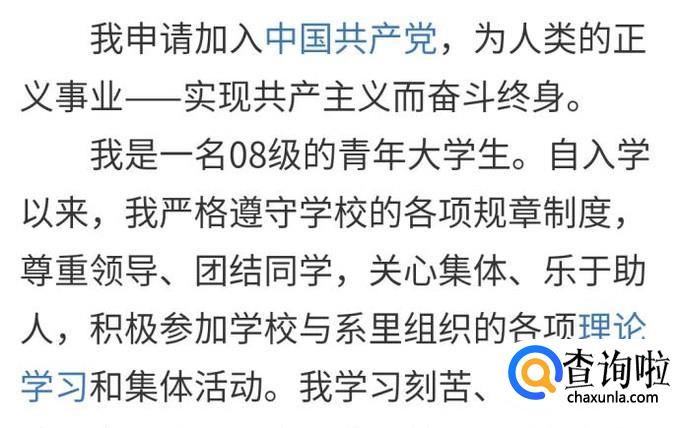 正文。这是入党申请书的关键部分,主要包括三方面内容:一是对党的认识和要求入党的动机,也就是为什么要入党。对党的认识,主要是对党的性质、纲领、奋斗目标、宗旨、党的路线、方针、政策的认识;入党动机,就是参加中国共产党的目的,即为什么要加入党组织。二是个人履历(学历和工作经历)、家庭成员和主要社会关系的情况。三是自己的优缺点和今后的努力方向。即个人在政治、思想、学习、工作、作风、纪律等方面的主要表现,特别是对自己存在的缺点和不足要敢于指出,并向党组织表明改正的决心和努力方向,如何以实际行动争取入党。
