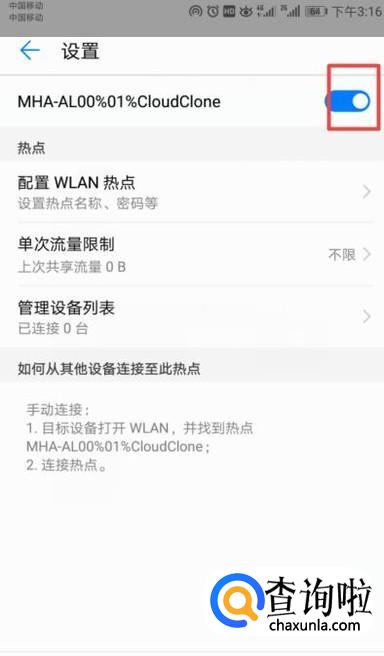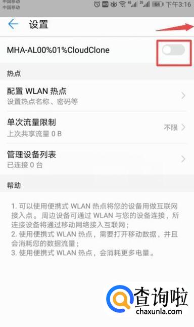 弹出的界面,我们将网络热点的开关向右滑动打开,这样我们就共享了网络热点了。