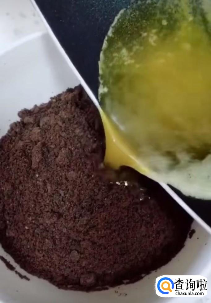 然后我们将奥利奥饼干压碎,倒入模具中,倒入融化好的黄油