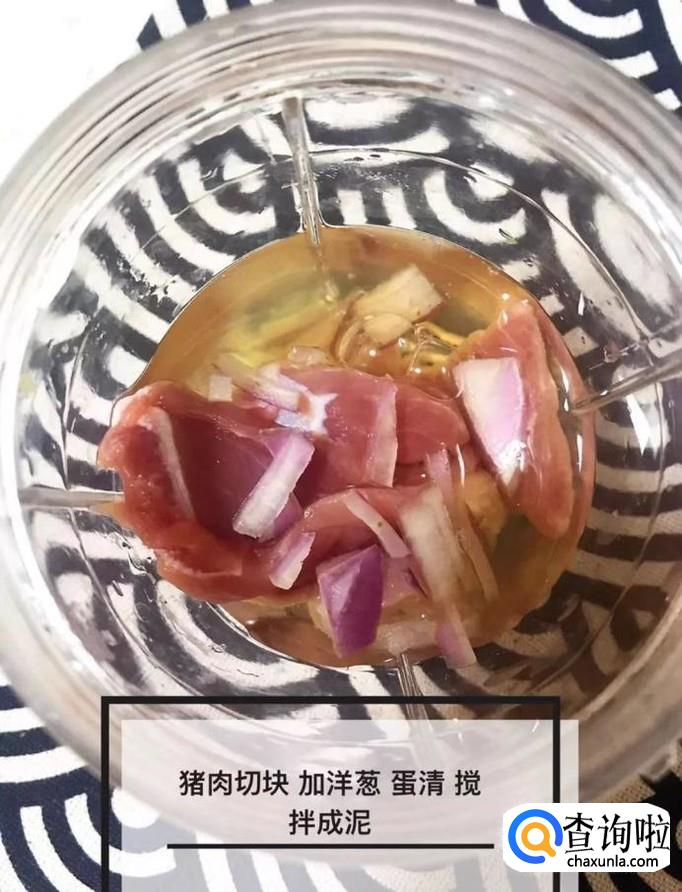 然后将猪肉切成块加入洋葱和蛋清倒入料理机中,打成泥,如下图所示。