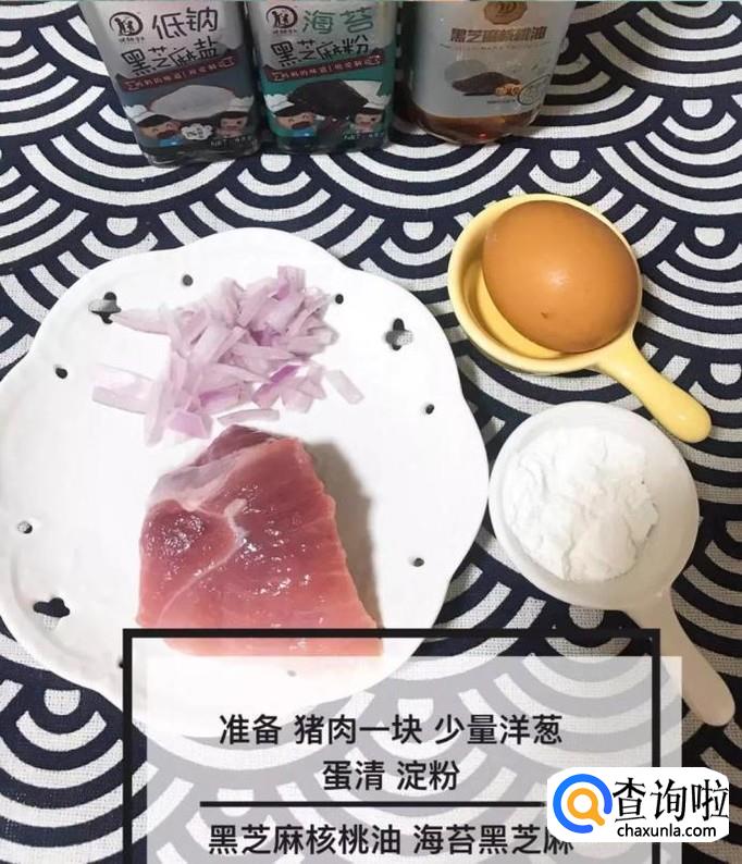 首先准备好所有要用到的食材,如下图所示。小贴士,猪肉一块,洋葱少量,鸡蛋一个,淀粉适量。
