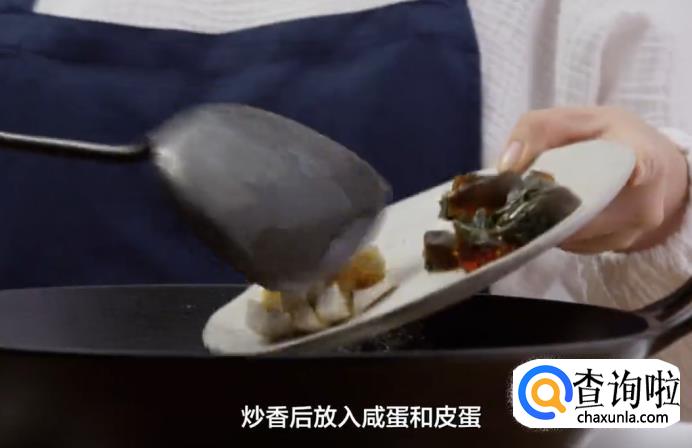 然后放入姜片,炒香后,放入咸蛋和皮蛋翻炒均匀。