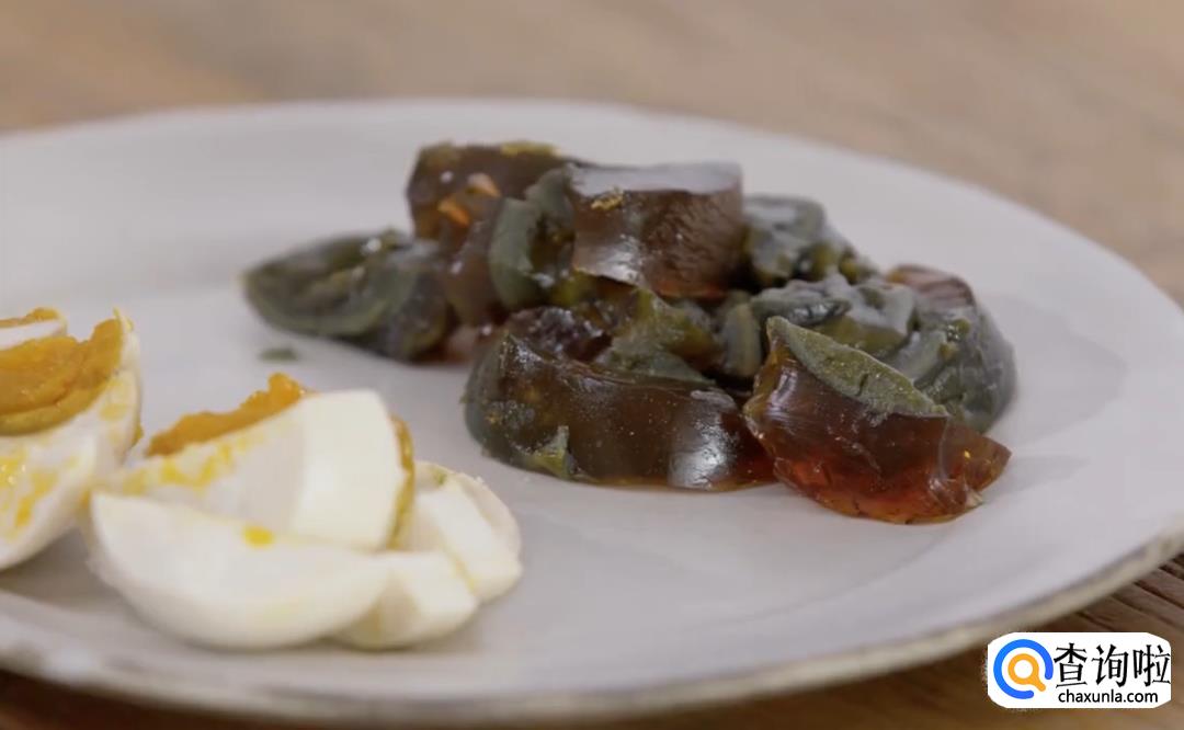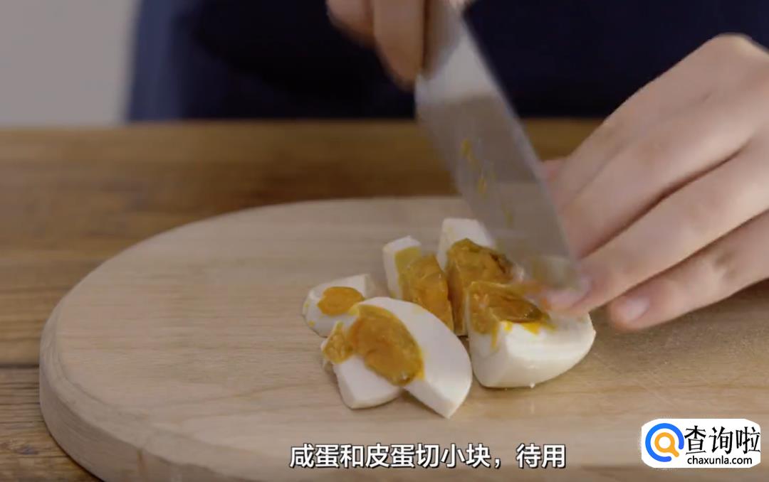 咸蛋和皮蛋切小块,装盘待用。