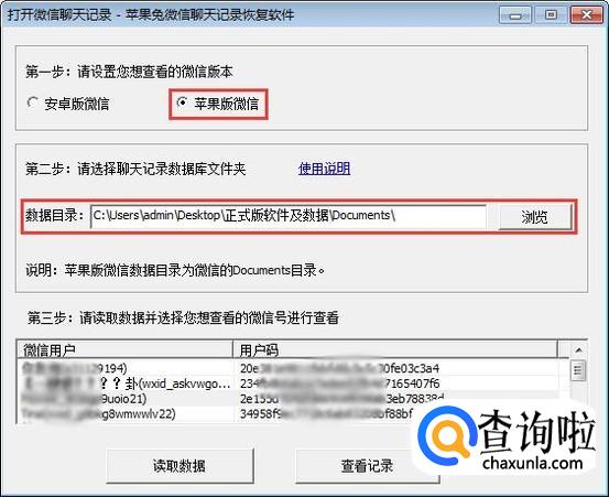 当数据导出到电脑上那就容易很多了。数据导出了再借助数据工具苹果兔微信聊天记录恢复软件来打开数据库。运行恢复软件,在打开的设置窗口中设置苹果版微信,数据目录就设置刚导出的Documents文件夹就能查到聊天记录。