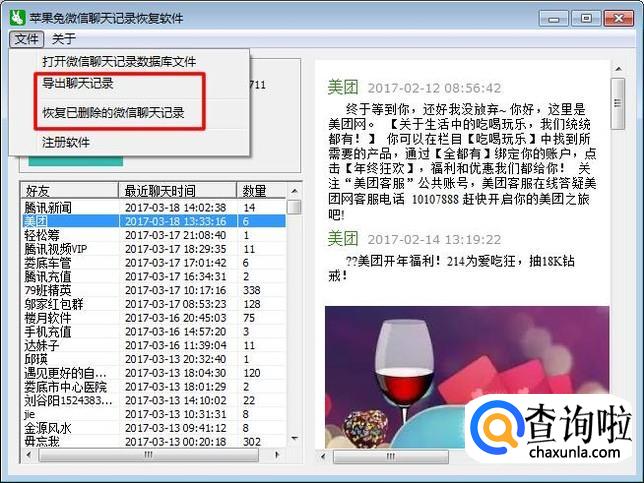 此时已经可以查到电脑上通过iTunes备份的微信聊天记录了。但此时还只能用工具打开看,而且还只是原来手机中没删除过的一些记录而已。如果想要将记录进行导出或者要把删除过的聊天记录恢复回来的话还需要点击软件左上角文件菜单中所相应的菜单操作即可。