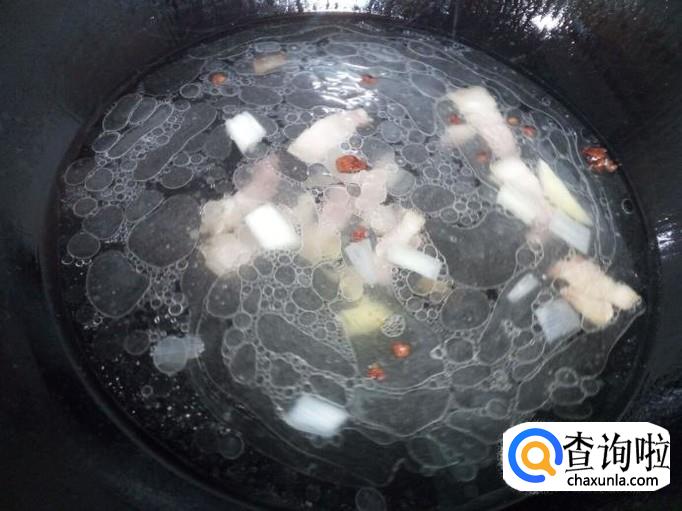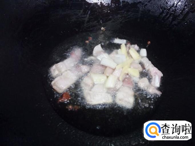 炒至肉下油,放入葱,姜翻炒,放入少许料酒,然后放入适量的水。