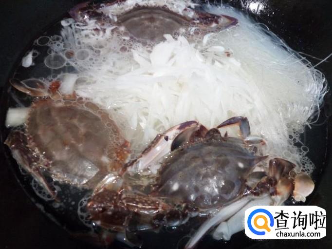 把萝卜丝,粉丝,虾皮,螃蟹一起放入水中,放入盐,大火烧开转中火煮。煮至五分钟的时间,放入味精,关火出勺。