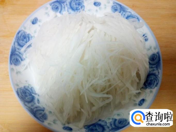 萝卜去皮,用水清洗干净,控干水分,切成丝。