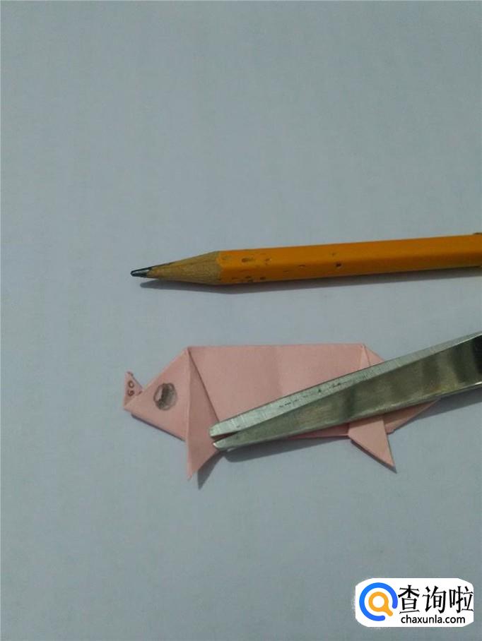 用铅笔在左边鼻子处画两个圈,表示鼻孔,在猪头的地方画一只眼睛。可爱的小猪就折完了。