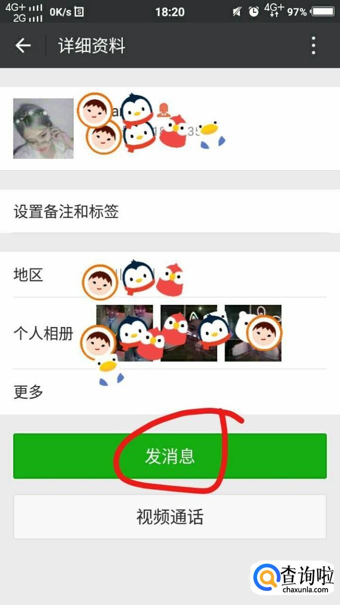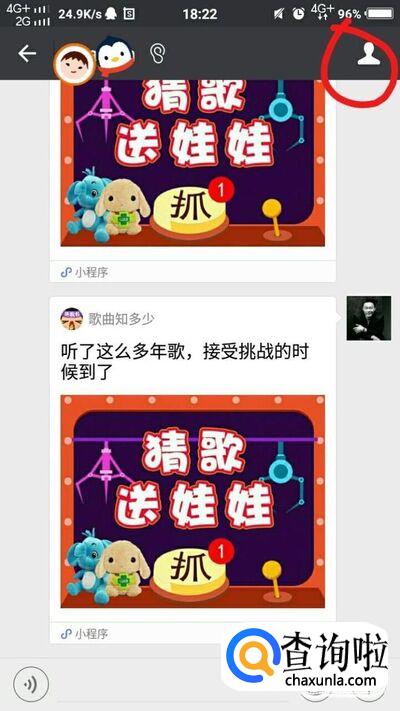 然后点击"发消息”,进入你们的聊天状态,然后点击右上角的人的图像。