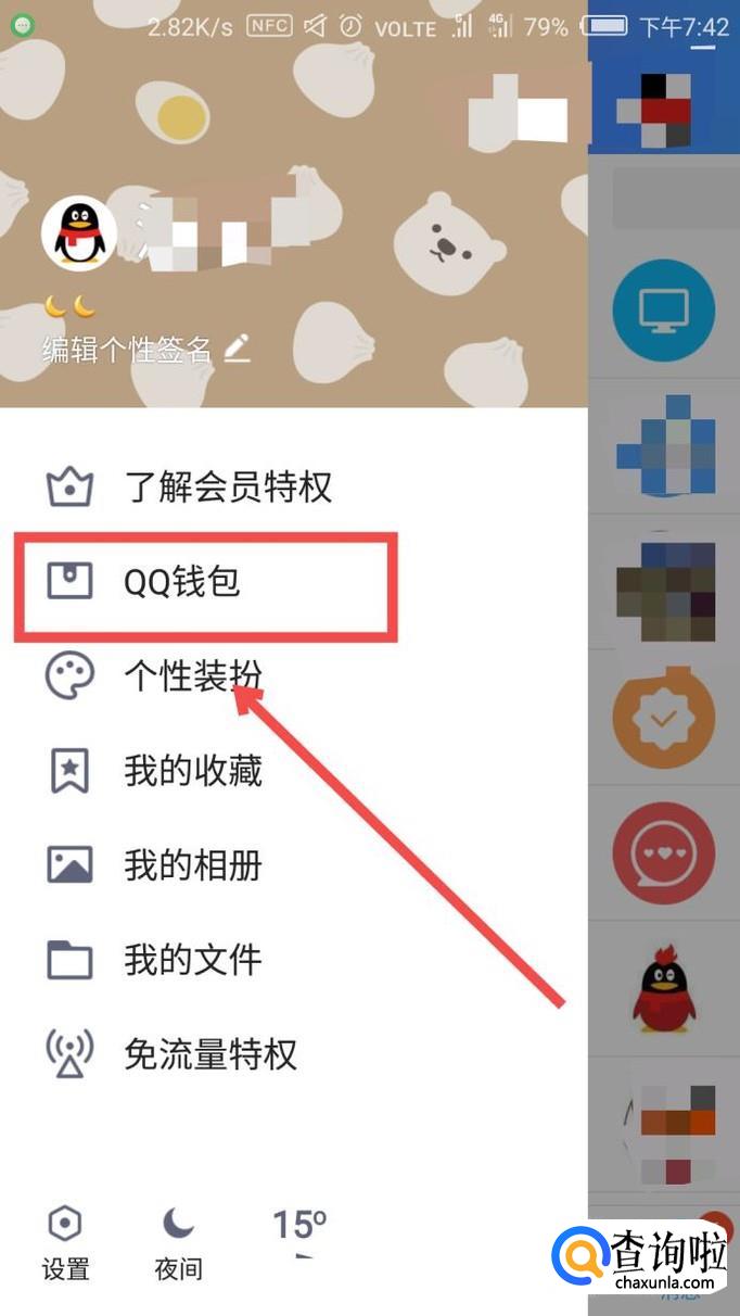当你点击你本人的头像后,左侧会弹出一个选项卡,在选项卡中找到【QQ钱包】,点击进入。