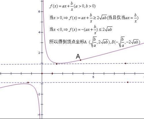 对勾函数的图像是分别以y轴和y=ax为渐近线的两支曲线,且图像上任意一点到两条渐近线的距离之积恰为渐近线夹角(0-180°)的正弦值与|b|的乘积。若a>0,b>0, 在第一象限内,其转折点为【(b/a)^(1/2),2(ab)^(1/2)】。对勾函数一阶导数:y'=-b/x^2+a。奇偶性:奇函数。