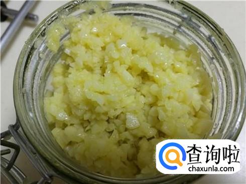 大蒜剥去蒜皮,拍扁之后放进去捣蒜缸里捣成蒜泥,一边捣一边加一些食盐和味素。