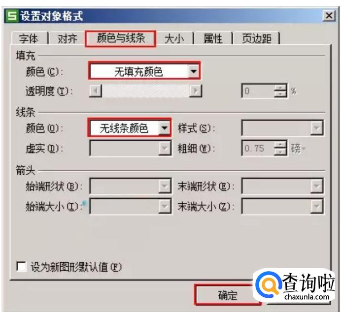 在同一个对话框中,单击“颜色与线条”选项卡,将颜色选择为“无填充颜色”,线条选择为“无线条颜色”然后单击“确定”选项。