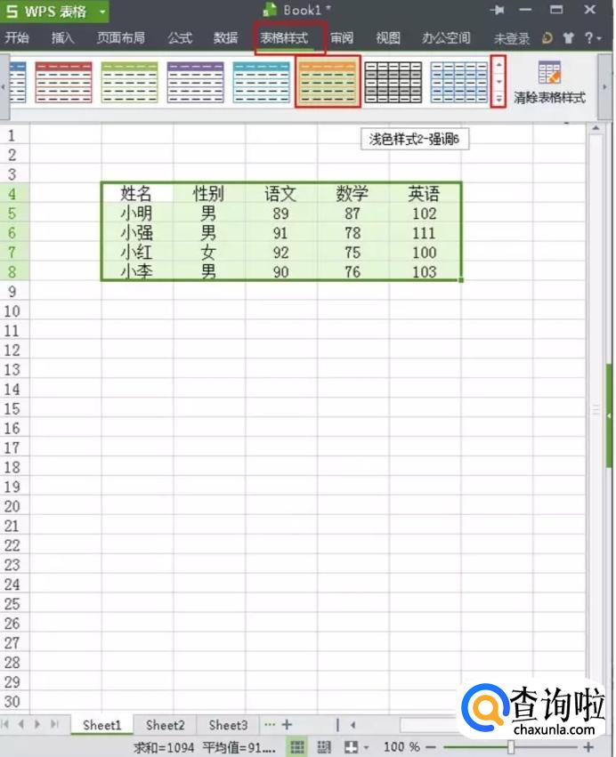 选中工作表中的所有数据,然后鼠标切换到功能区的“表格样式”选项卡,通过点击表格样式区域的上下按钮来选择自己喜欢的一个样式。