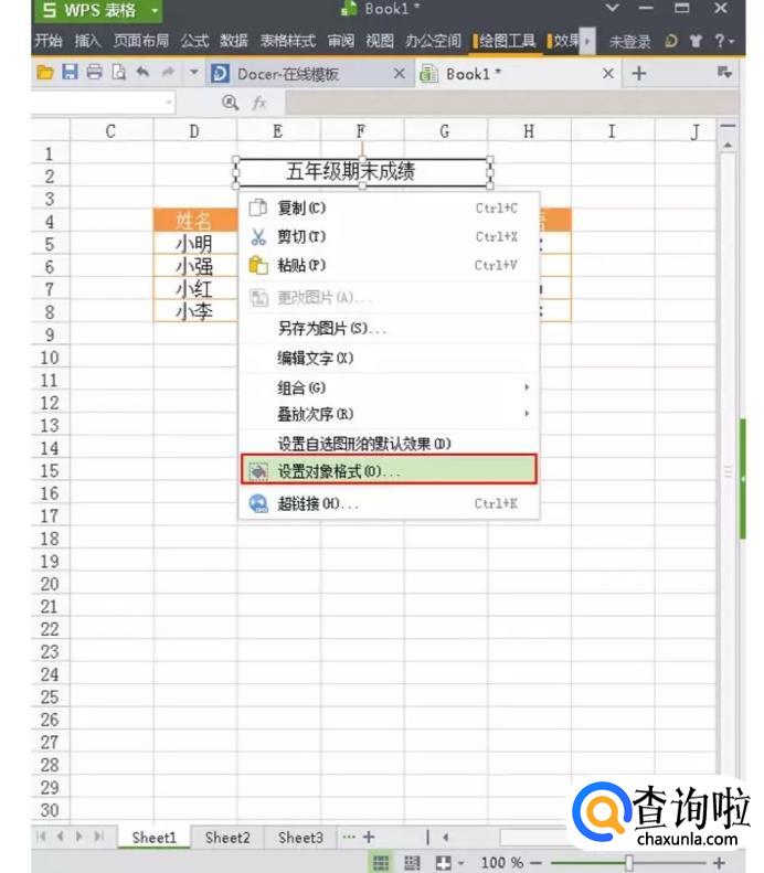 在数据表格的上方插入文本框,并且输入文字标题,然后选中整个文本框,点击鼠标右键,在弹出的快捷菜单中选择“设置对象格式”命令。