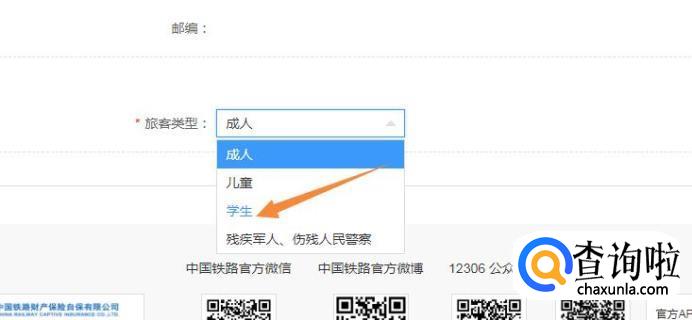 在旅客类型下拉框内,选择“学生”,在弹出的页面中,点击“确定”。