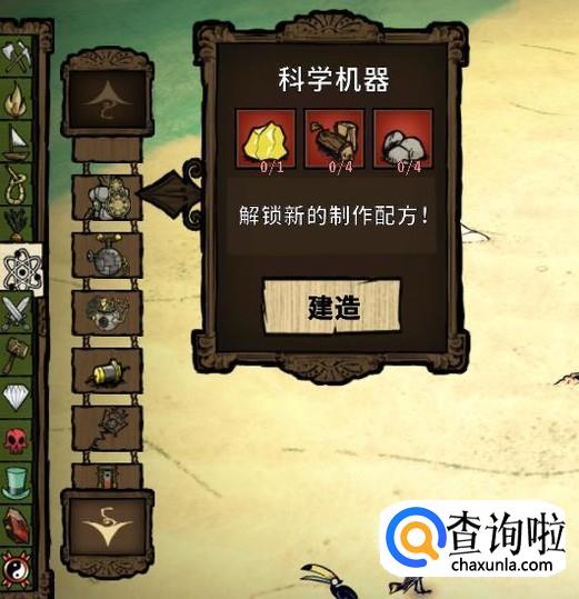 刚刚进游戏的时候,防风火炉是处于锁定状态的,我们需要先建造一个科学仪器来解锁。