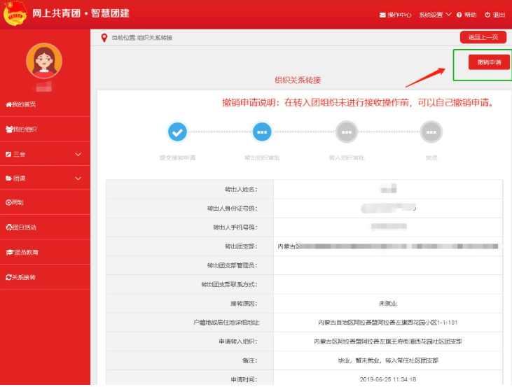 若团员尚未落实工作单位,可将本人的团组织关系转入户籍所在地即土城镇赞台村团支部。毕业生团员在团组织关系转出1个月内到转入团支部或基层团支部报到,并且需在智慧团建平台进行相应的报到操作,对方在系统接受了组织关系才算完成转接手续。