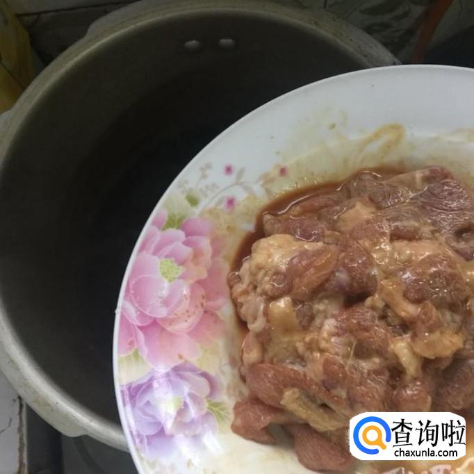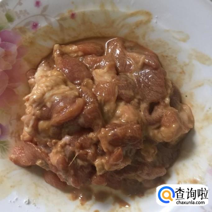 然后把瘦肉切成薄片并用适量的地瓜粉裹一下,如下图所示。