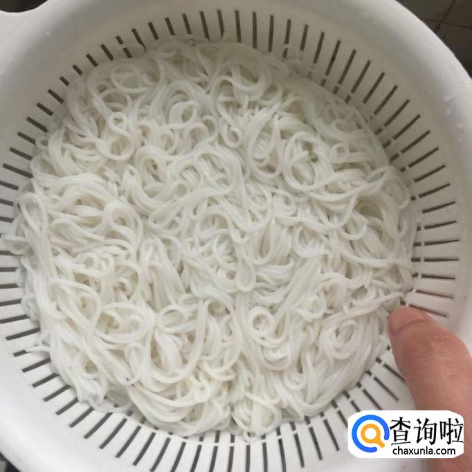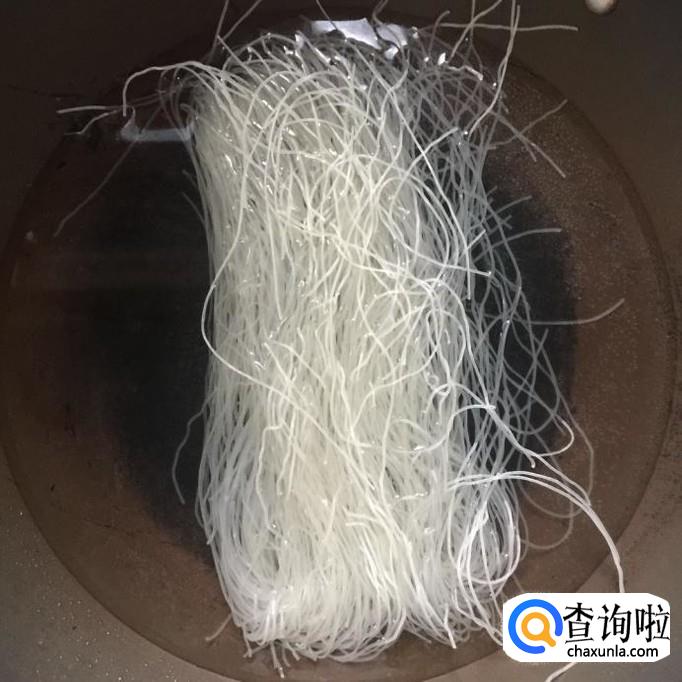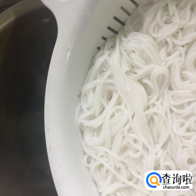 然后用另一口锅,锅中放入适量的清水,待水烧开,放入半片粉干烫十分钟捞出沥干,如下图所示。