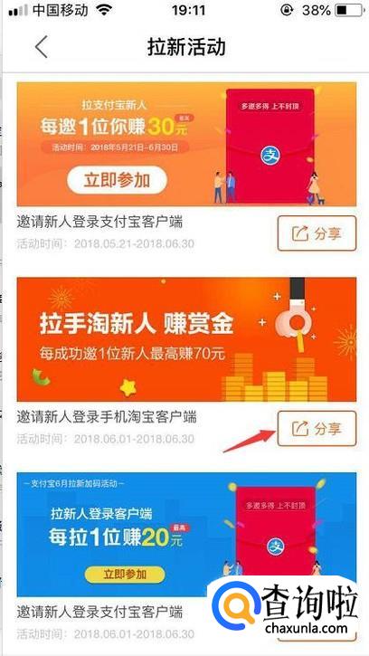 进去后我们自行选择要拉新的活动,选择后点击右边的分享即可。