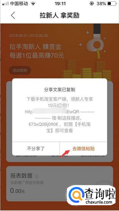 分享的时候直接通过微信复制粘贴给好友,好友注册登录就算成功拉新了。