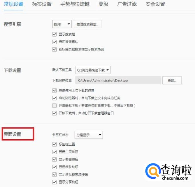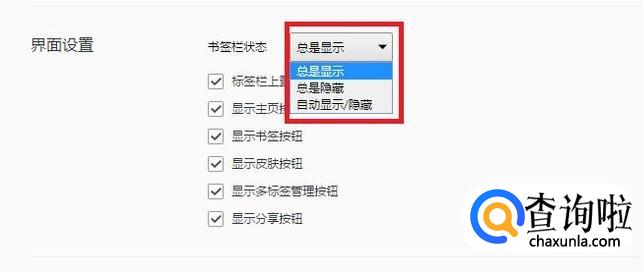 在“书签栏状态”选项中,选择“总是显示”,即可让快捷栏的书签状态栏显示出来。