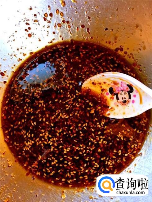 准备辣椒油,蒜泥,以及白糖、蒜末和适当食盐、白醋,调成汁放在碗里。