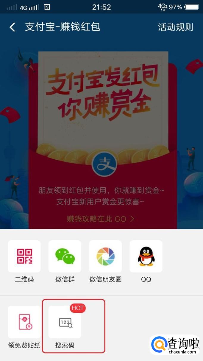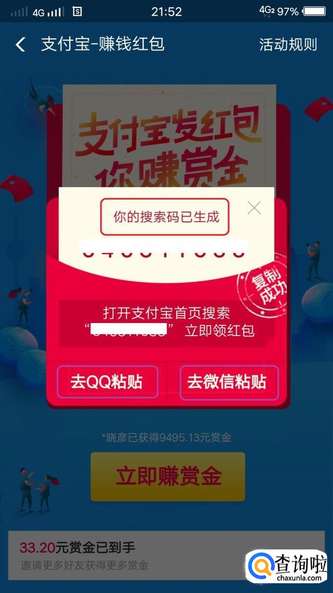 然后,我们点击“立即赚赏金”,下方就会出现浮动框,我们就能看到红包搜索码了,如图所示,点击“搜索码”。