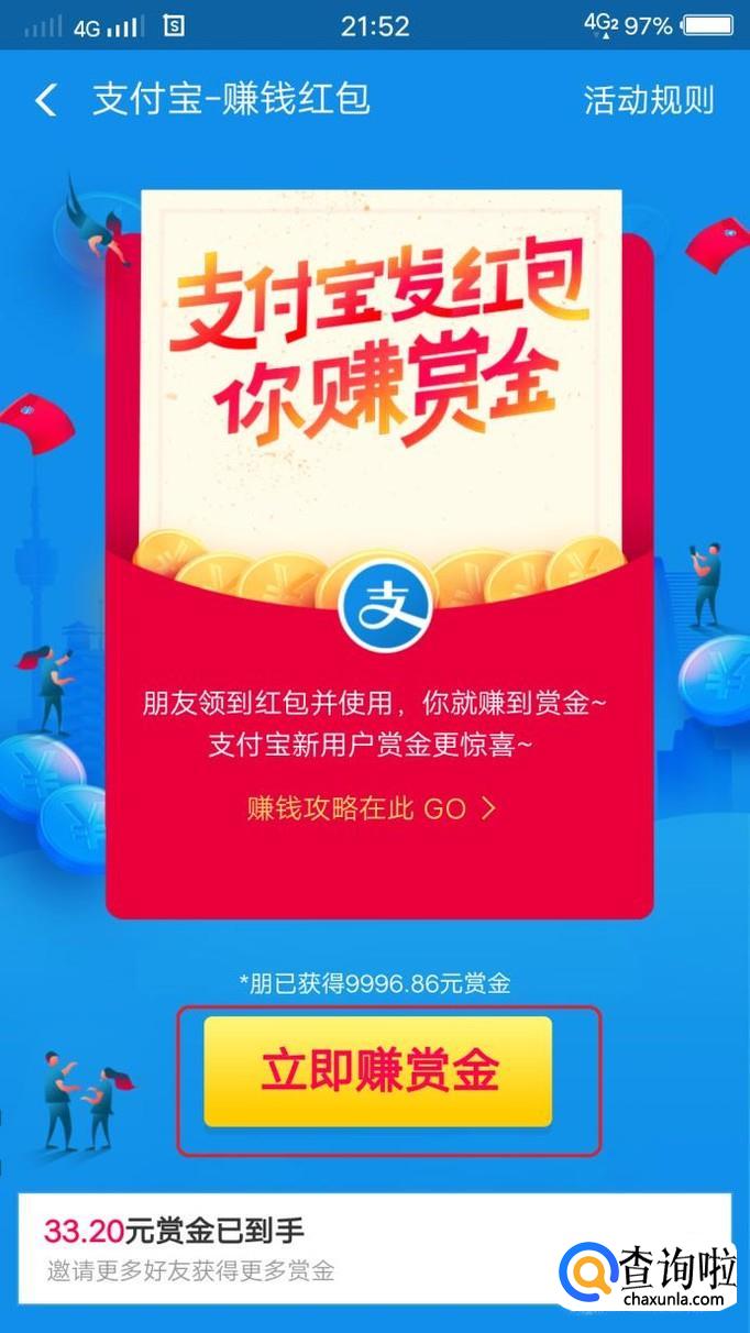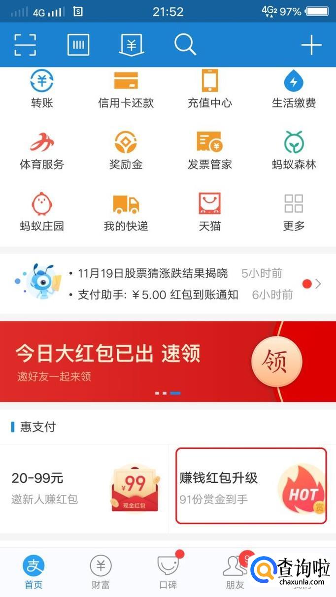 首先,我们打开手机支付宝,在首页的中间,可以看到图示的“赚钱红包升级”活动按钮,点击一下。